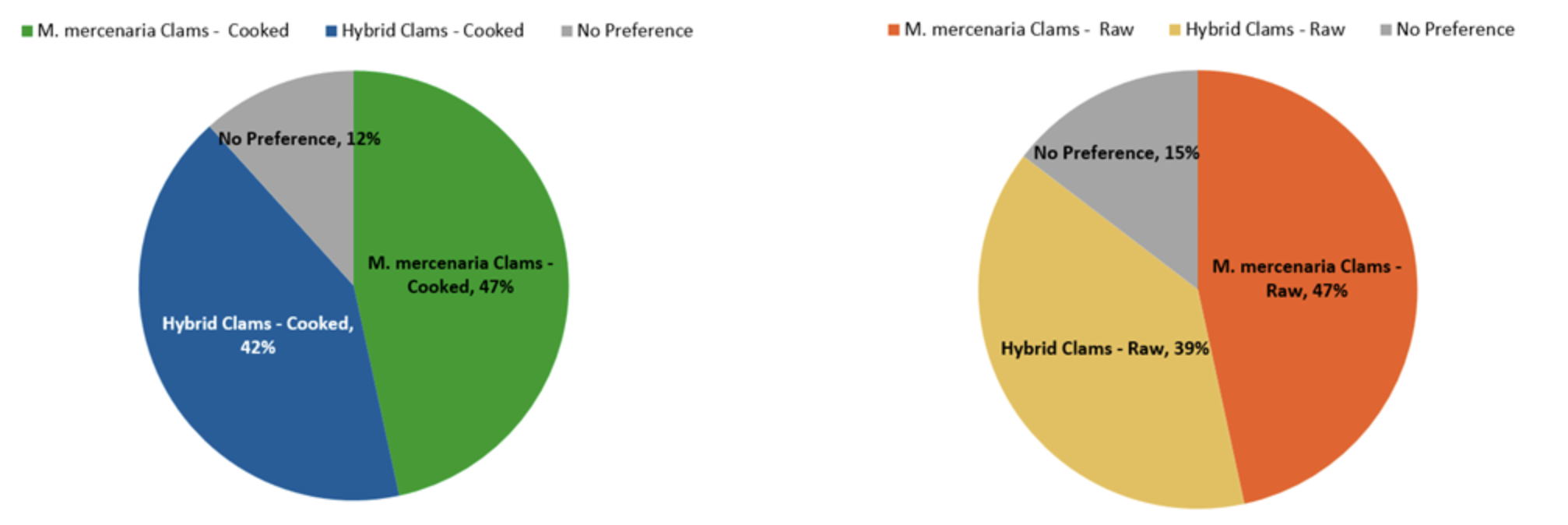 Preference: There was no preference for either raw M. mercenaria and raw hybrid and no significant preference for either cooked M. mercenaria and cooked hybrid. The resultes support earlier results from the University of Florida that showed no differences in acceptance or preferences for hybrid clams over M. mercenaria sold as fresh clams (Sturmer et al., 2009).